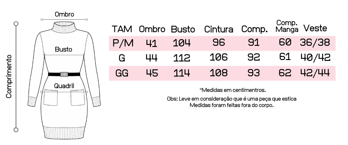 Recomendamos que tenha em mãos suas medidas de busto, cintura e quadril para que possa fazer a comparação com as medidas da peça, pois cada uma tem suas medidas tiradas exclusivamente.