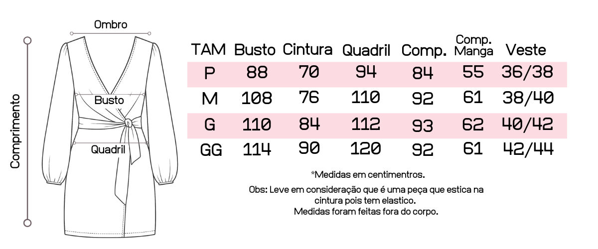 - Modelo da foto: 1,74 m de altura, 103 cm de busto, 84 cm de cintura e 114 cm de quadril, vestindo tamanho G.