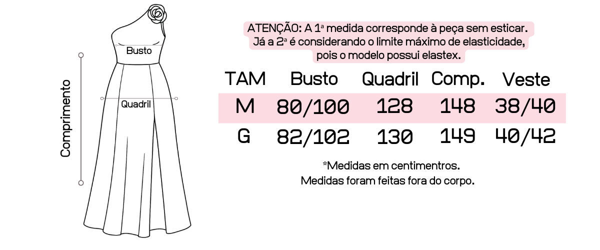 Recomendamos que tenha em mãos suas medidas de busto, cintura e quadril para que possa fazer a comparação com as medidas da peça, pois cada uma tem suas medidas tiradas exclusivamente.