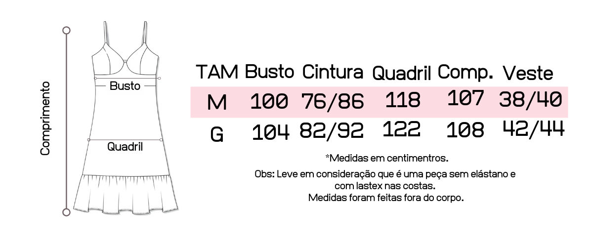 Sendo uma marca nacional, temos como objetivo realçar a beleza dos corpos de mulheres reais brasileiras e entregar peças fiéis aos anúncios. Pelo que todas as nossas coleções são desenvolvidas tendo em conta as nossas particularidades nacionais. Gisele usa tamanhos 40/42 e G de quadril e 44 de busto. Contamos com um time para auxiliar na sua escolha de tamanhos.