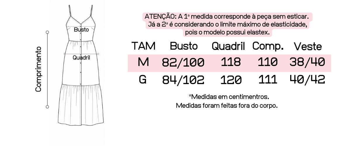 Recomendamos que tenha em mãos suas medidas de busto, cintura e quadril para que possa fazer a comparação com as medidas da peça, pois cada uma tem suas medidas tiradas exclusivamente.